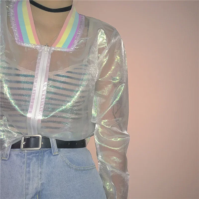 Harajuku Summer Women Jacket Laser Rainbow Symphony Hologram Women BasicCoat Clear Iridescent Transparent Bomber Jacket Sunproof