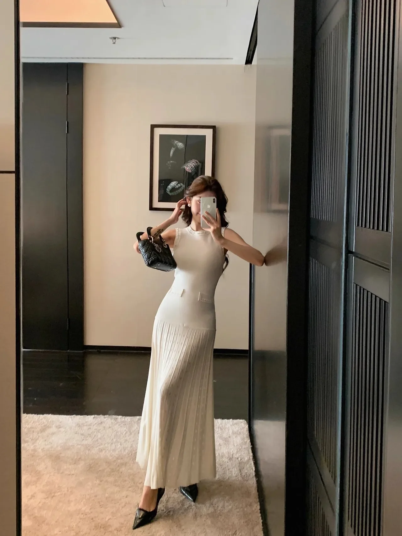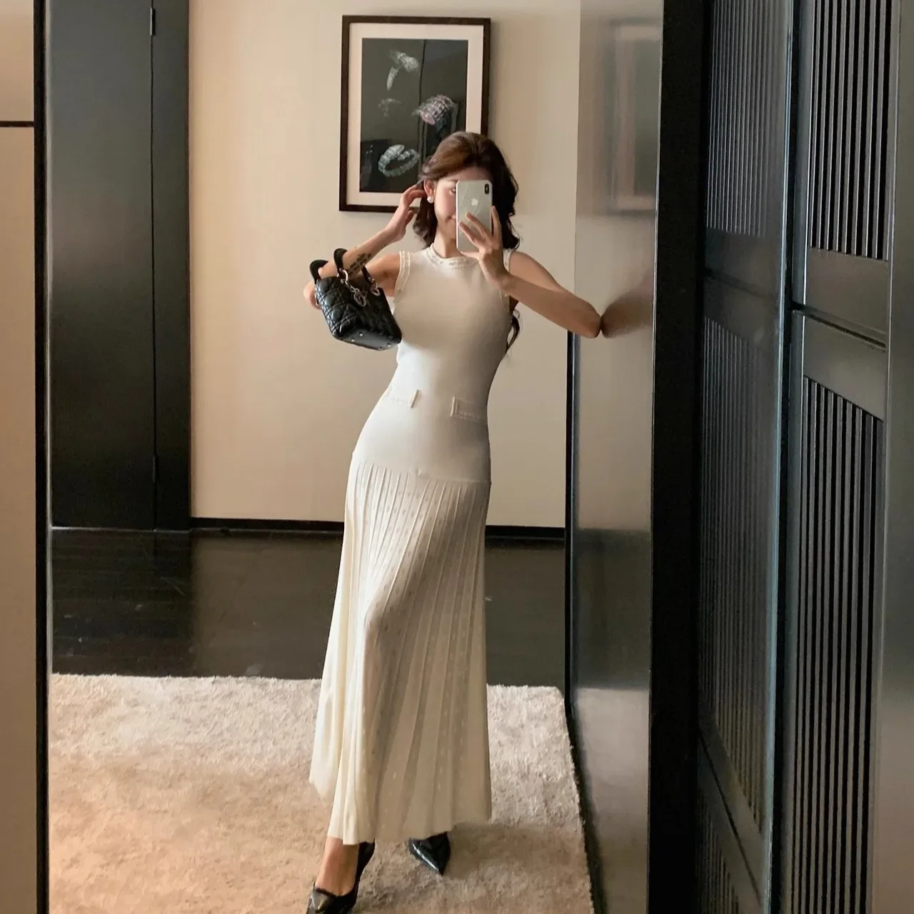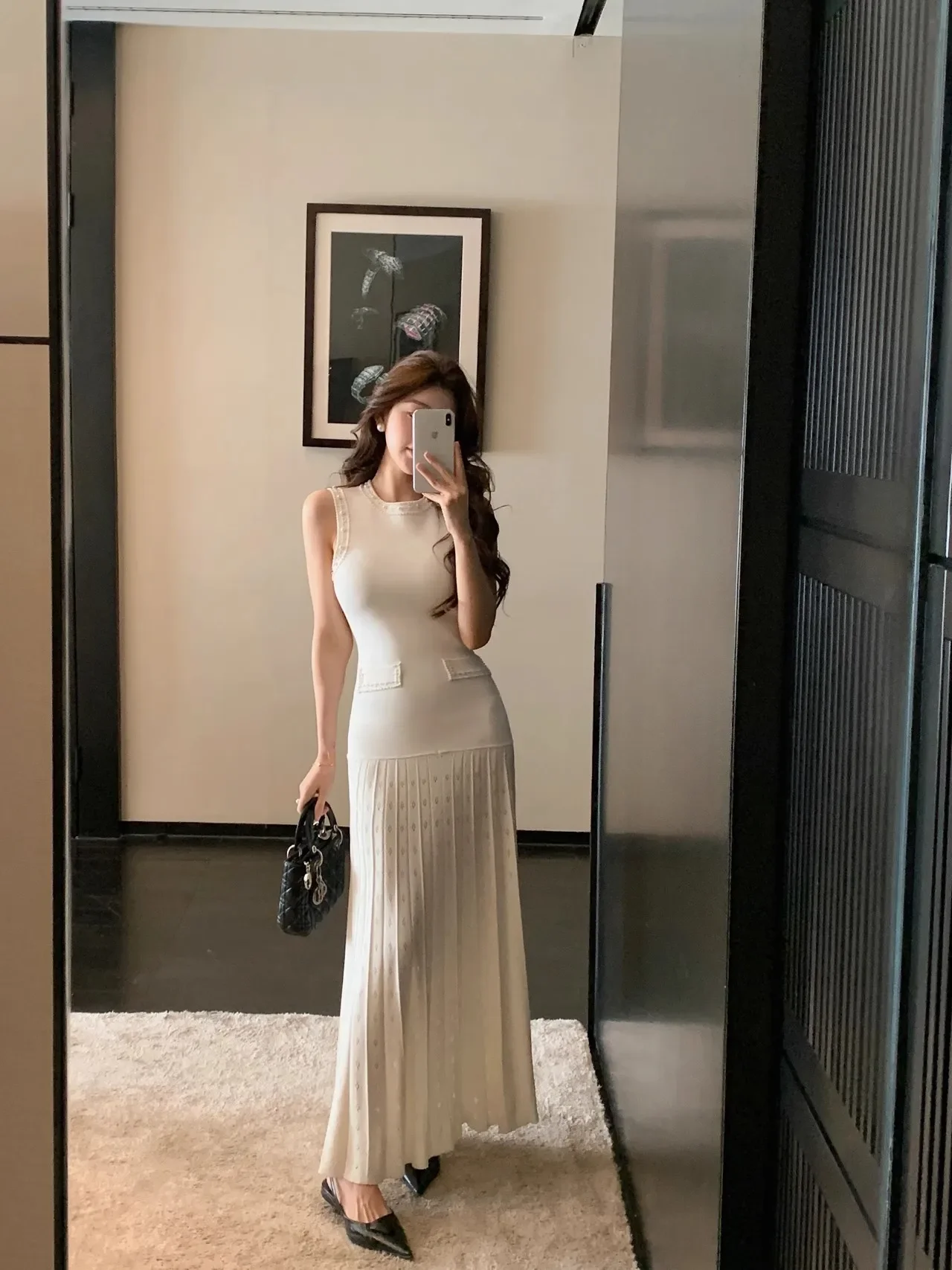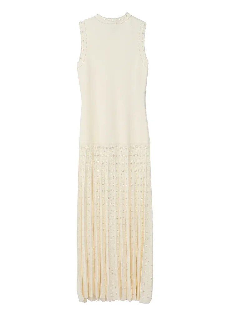 Black Beige Pearl Round Neck Sexy Hollow Out Knit Sleeveless Long Dress Women Summer Blue Vest Dresses Ladies Fashion Vestidos
