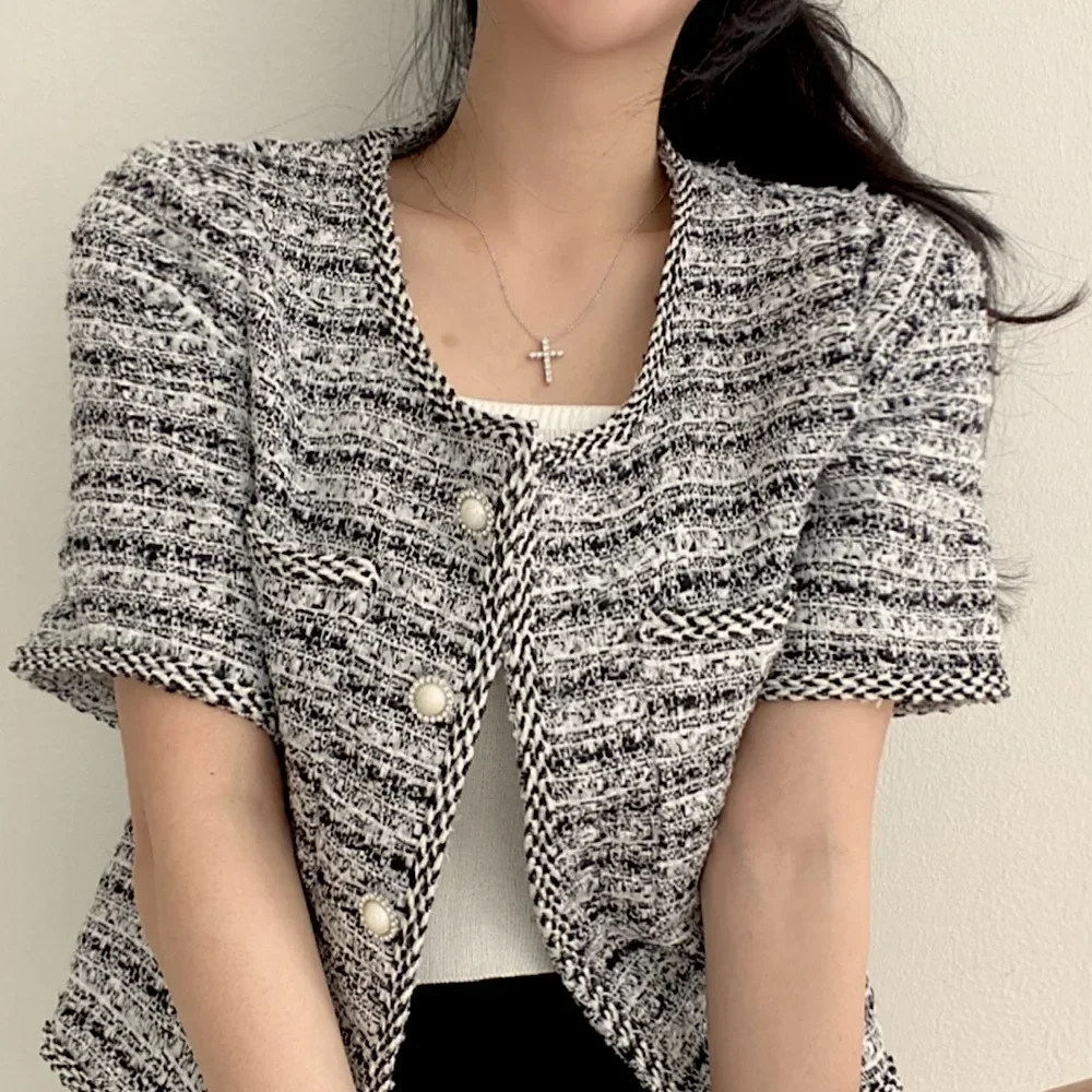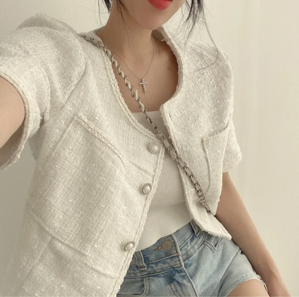 Chic Design French Style Women's Summer New Socialite Jacket Cardigan Short Top With Button Decoration Regular Sleeve