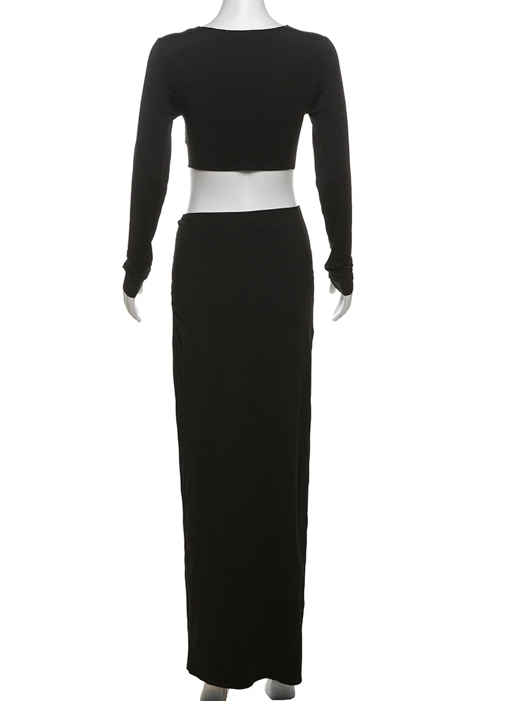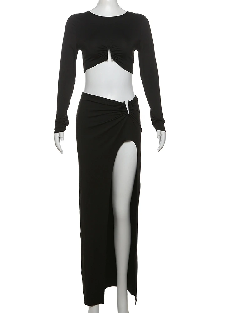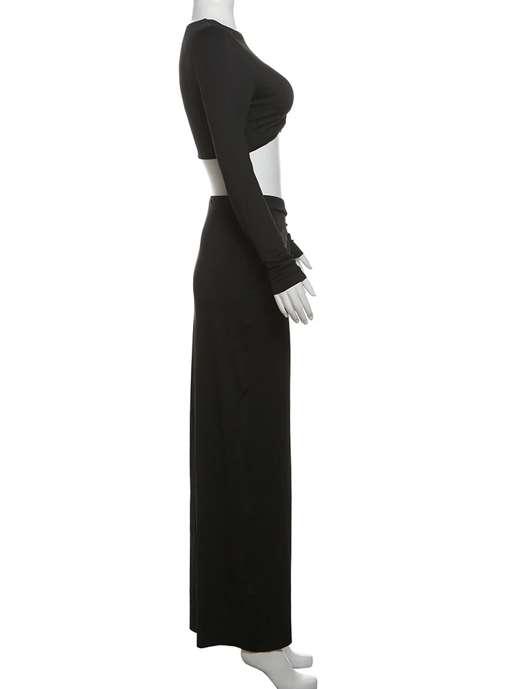 Classic Matching 2 Piece Set Women Fashion Solid Long Sleeve O-neck Crop Tees+Splited Maxi Skirts Female High Street Suits