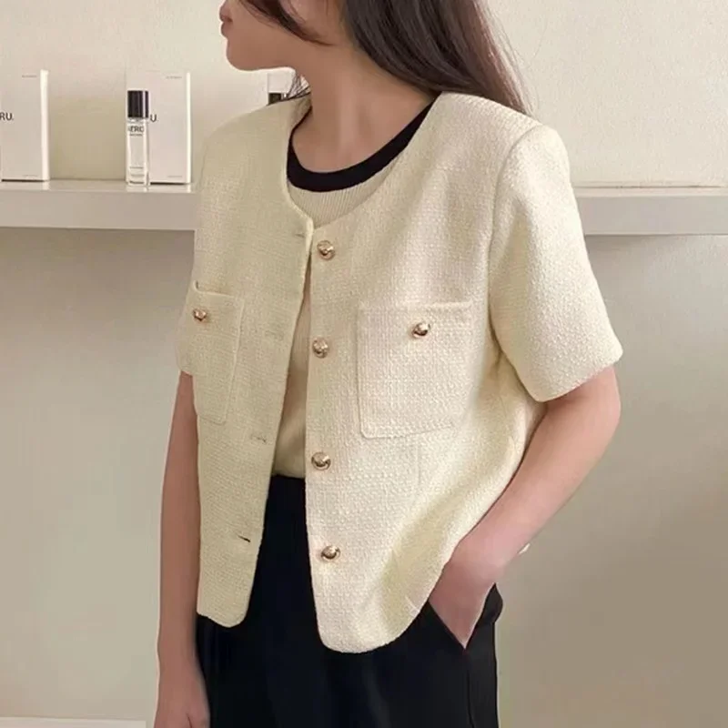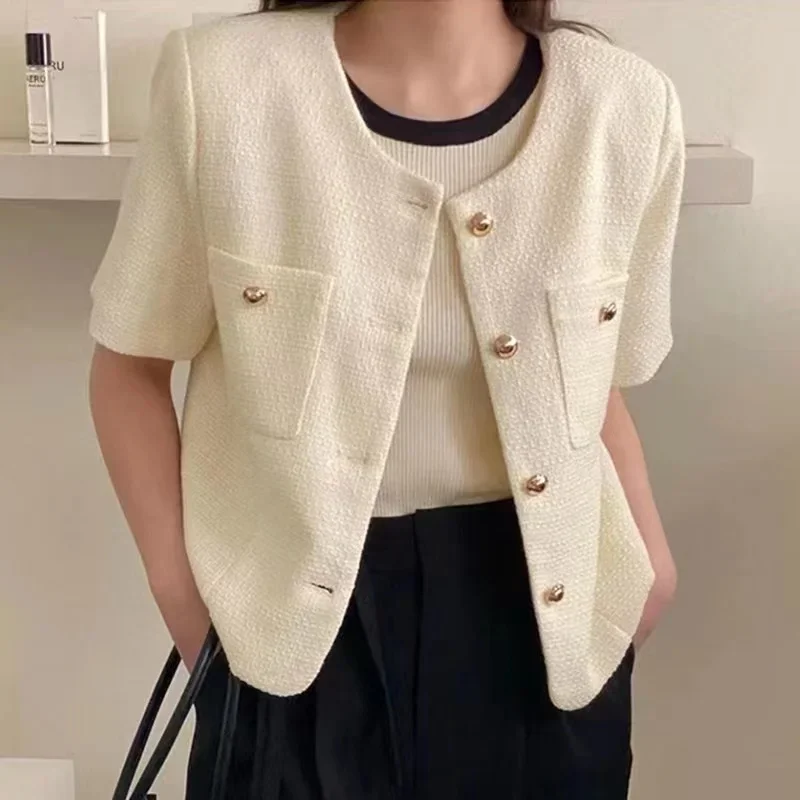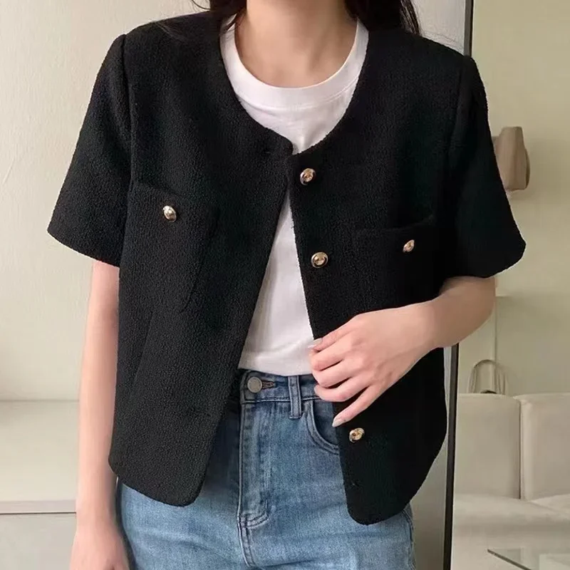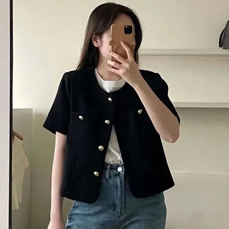 Dongda Gate Summer Loose ort Sve Woolen Coat Women's Button up Top Casual Straight Cut Single Button Multiple Pure Color