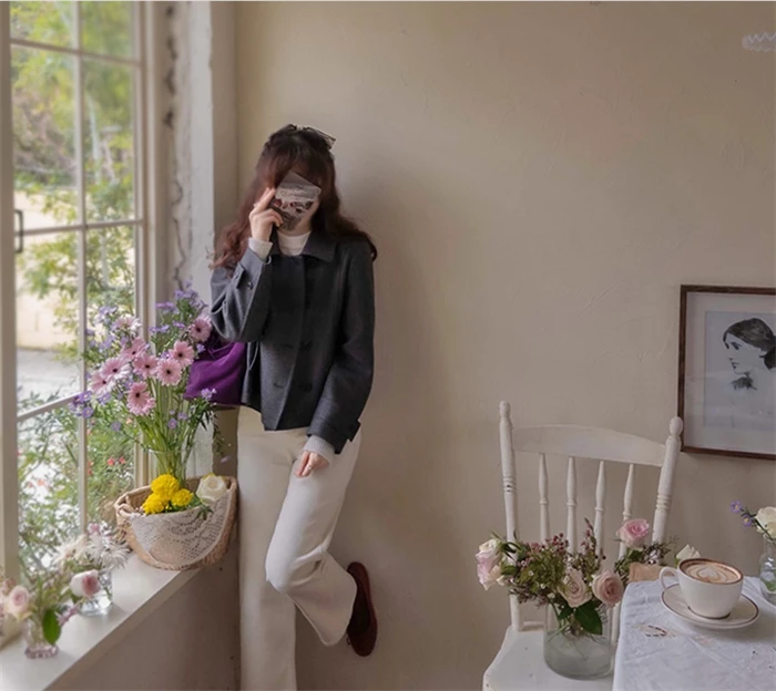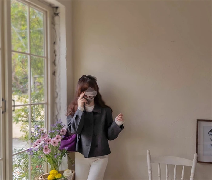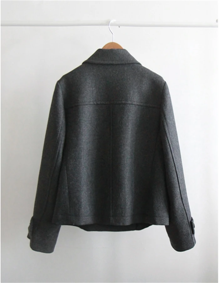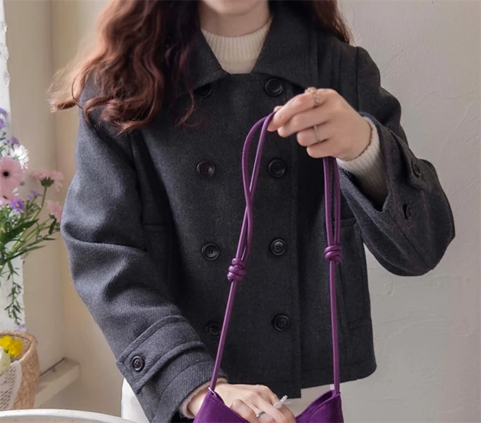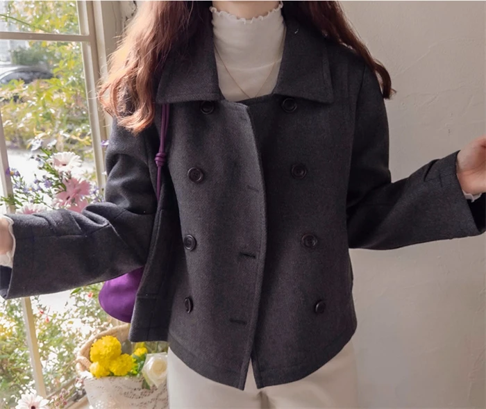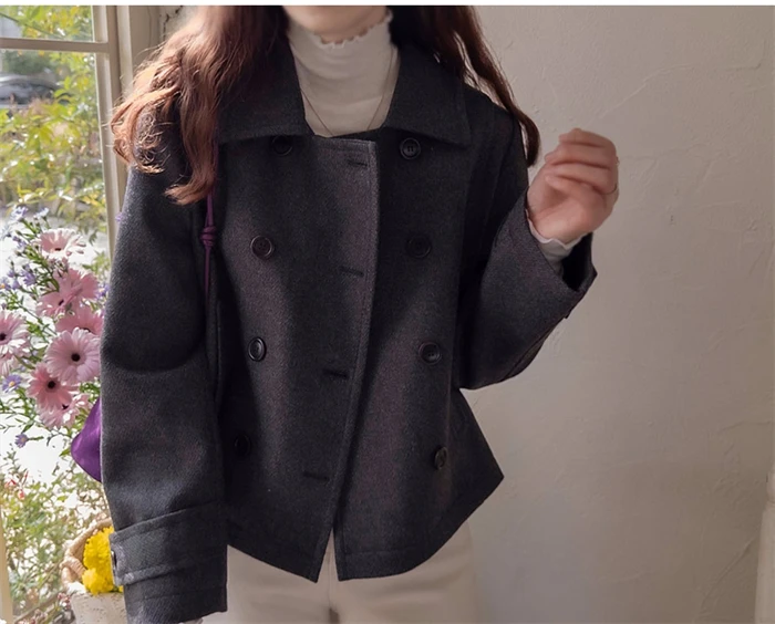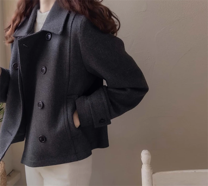 Double Breasted Woolen Coat Women Loose Turn-down Collar Long Sleeve Short Jacket Autumn Winter Elegant Casual Outwear
