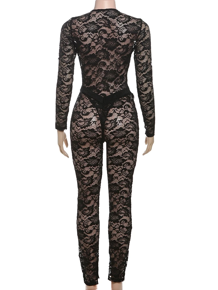 Embroidered Women 2 Piece Sets Sexy Coquette Sheer V-neck Trim Bodysuits+Matching Slim Pants Female Nighout Outfits