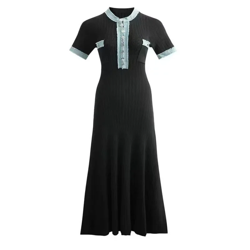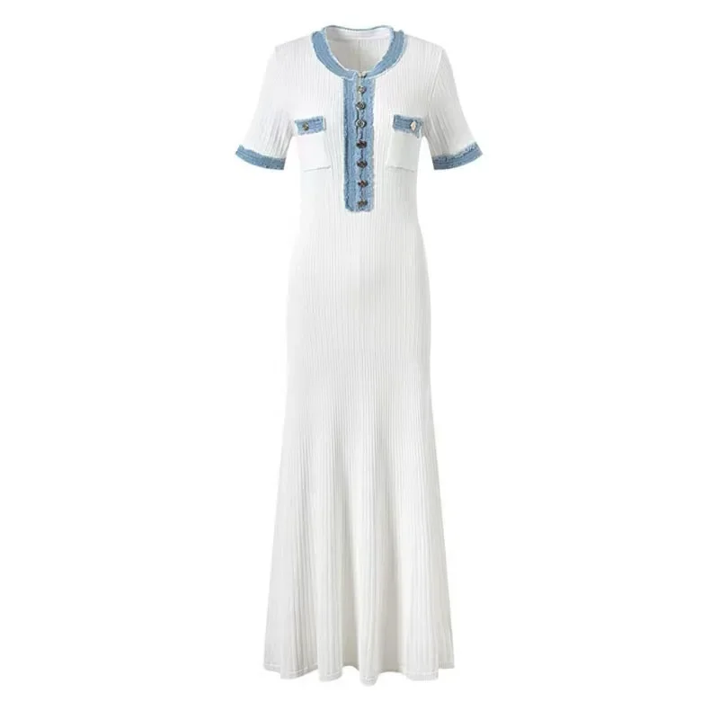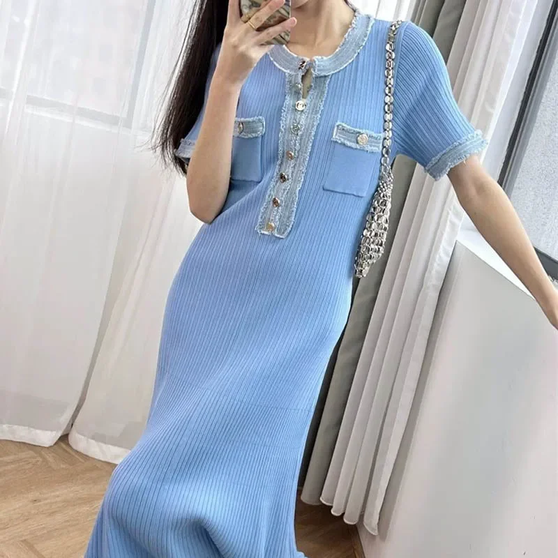 Korean Fashion Women Patchwork Round Neck Short Sleeved Single Breasted Knit Dress Summer New Elegant Holiday Office Long Dress