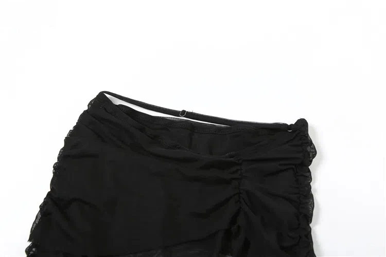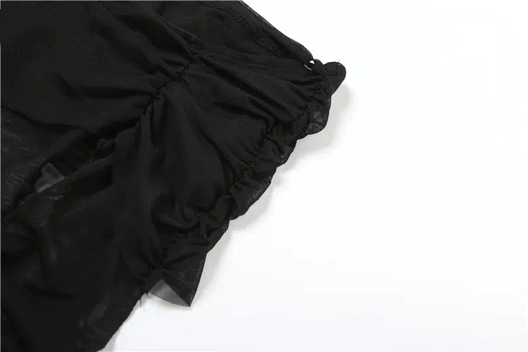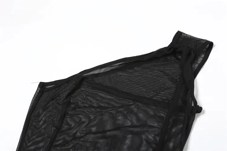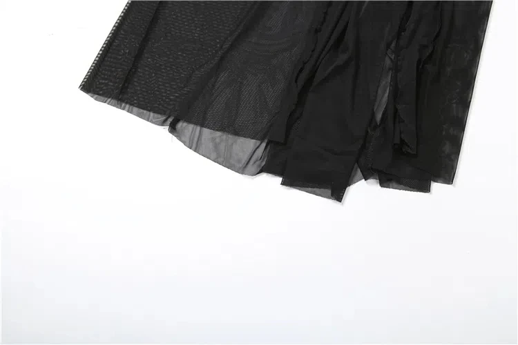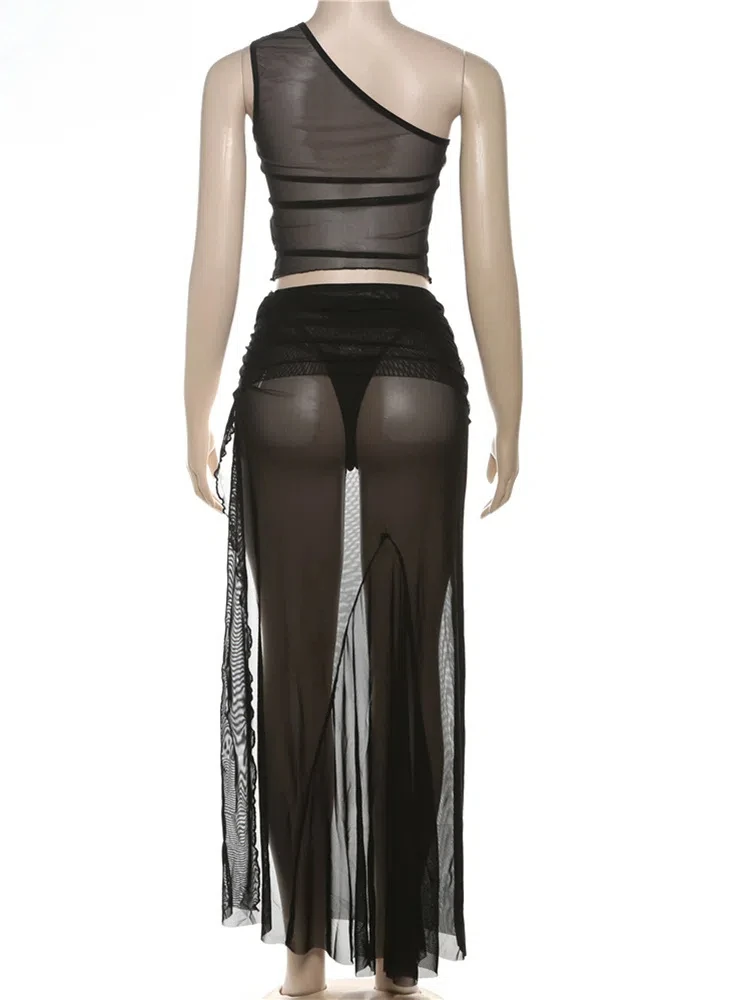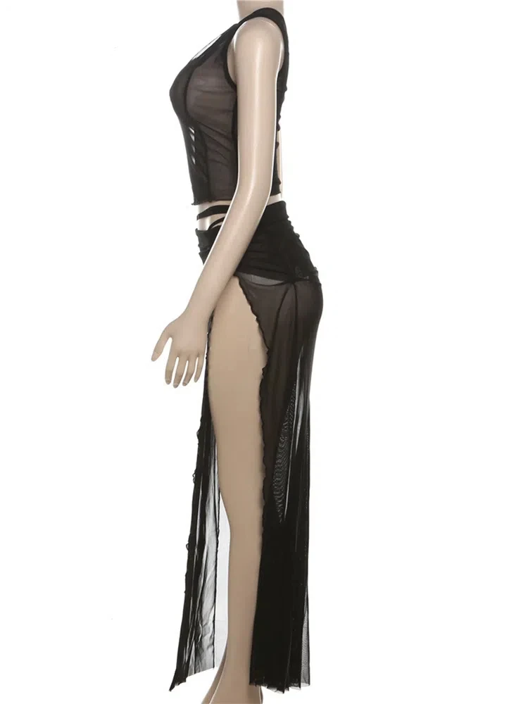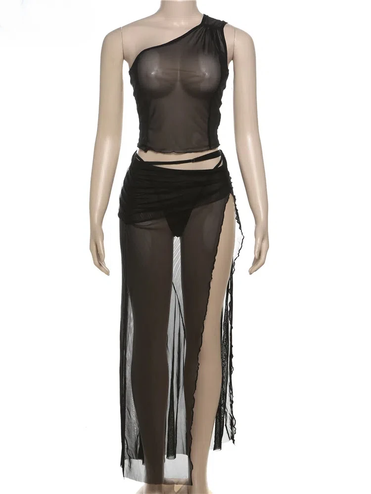 Mesh 3 Piece Set Women Sexy Vacation Slash Neck Tank Tops+Basic Underpants+Ruched Split Maxi Skirts Mujer Matching Suits