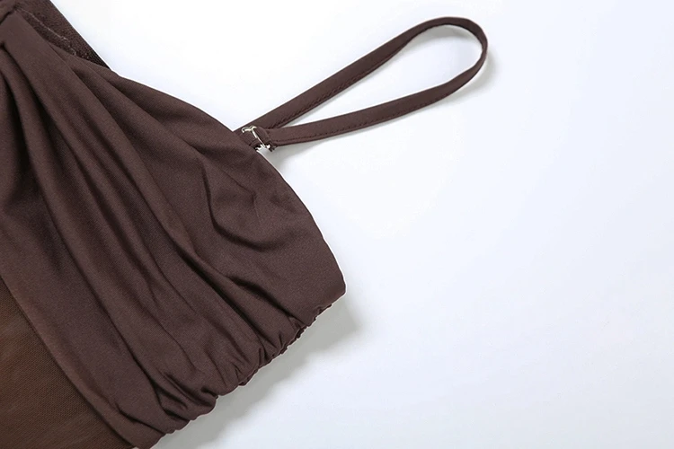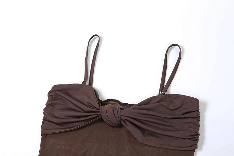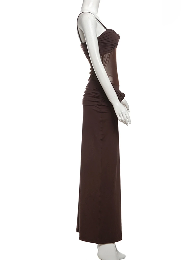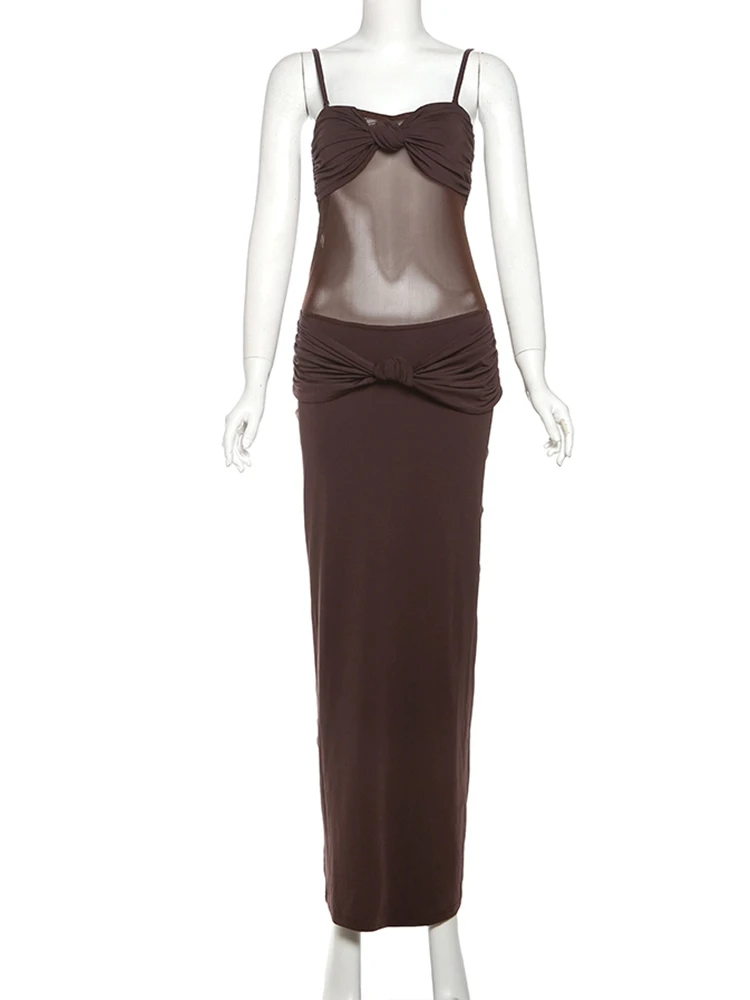 Mesh Suspendency Women Maxi Dress Sexy See Through Tied Patchwork Low Neck Backless Bodycon Female Fashion Party Vestidos