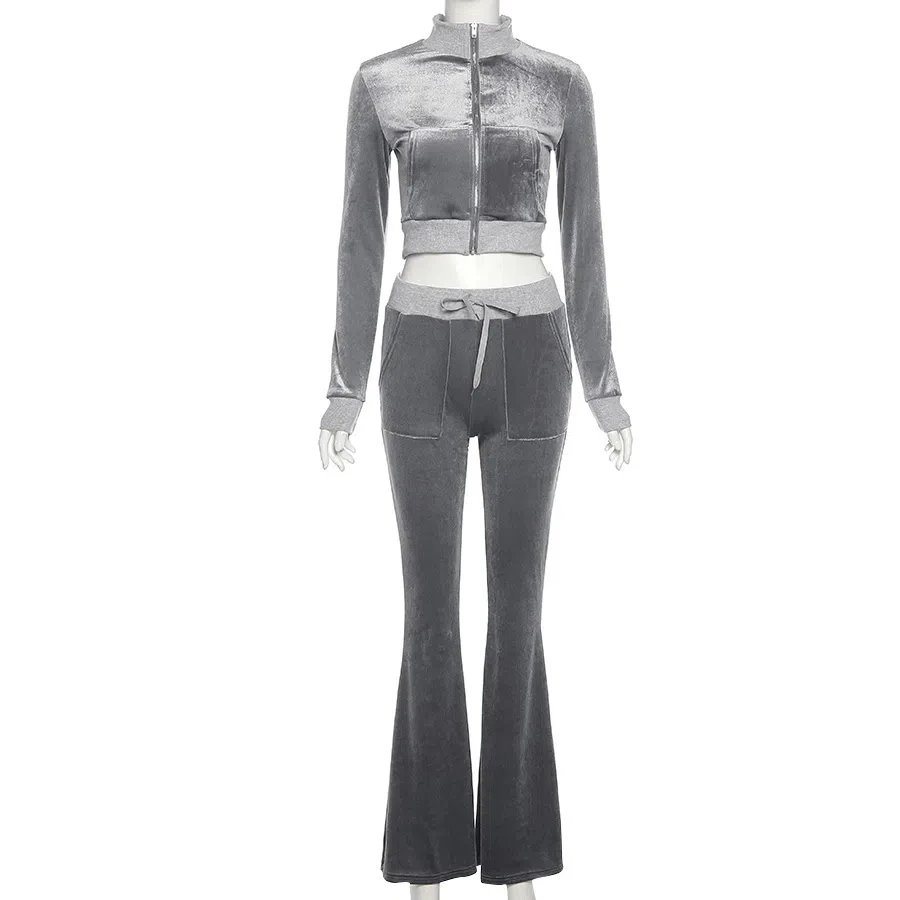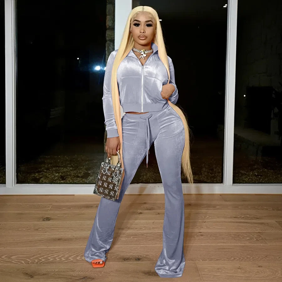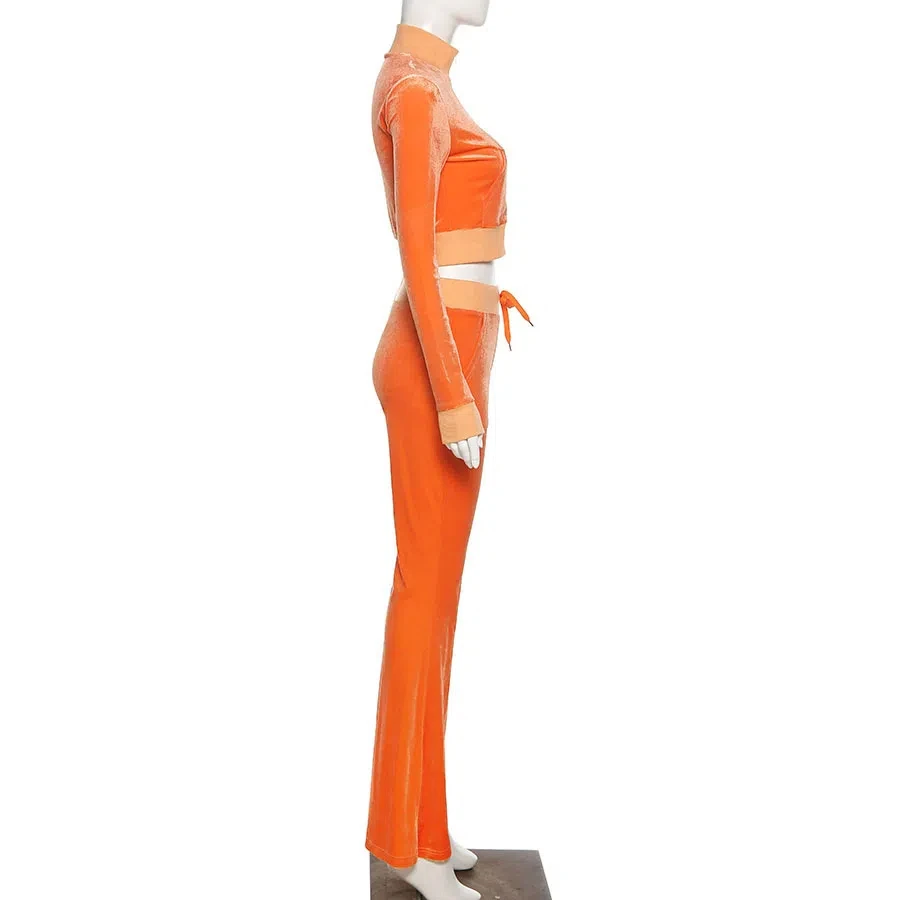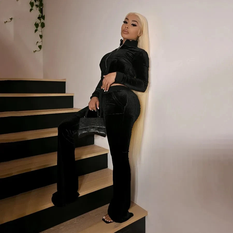 Solid Velour Two Piece Set Women Simple Casual Zipper Long Sleeve Turtleneck Top+Bandage Lace Slim Female Wide Leg Pants