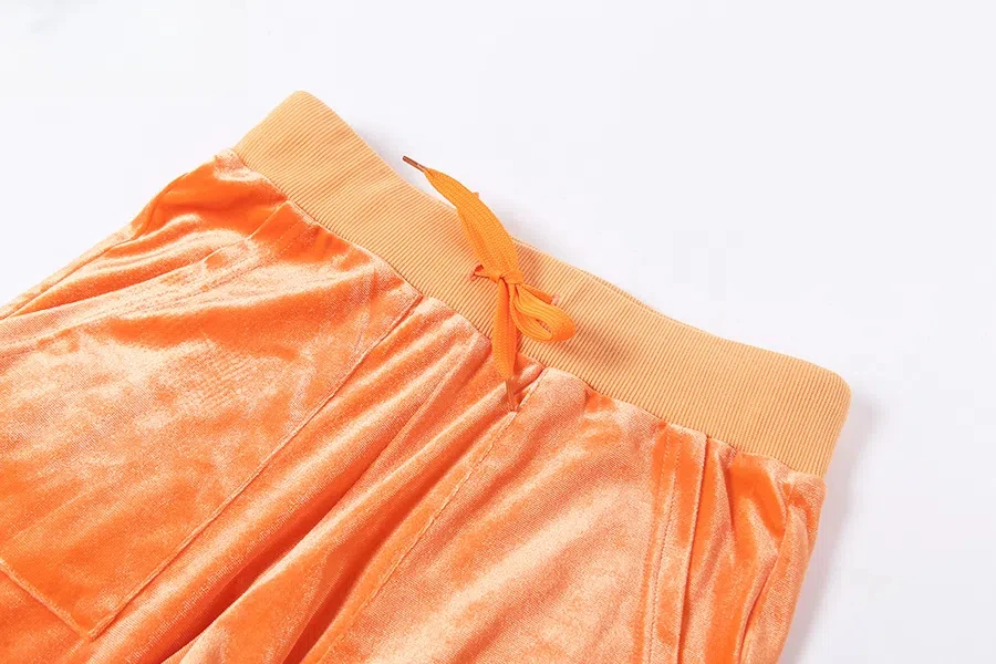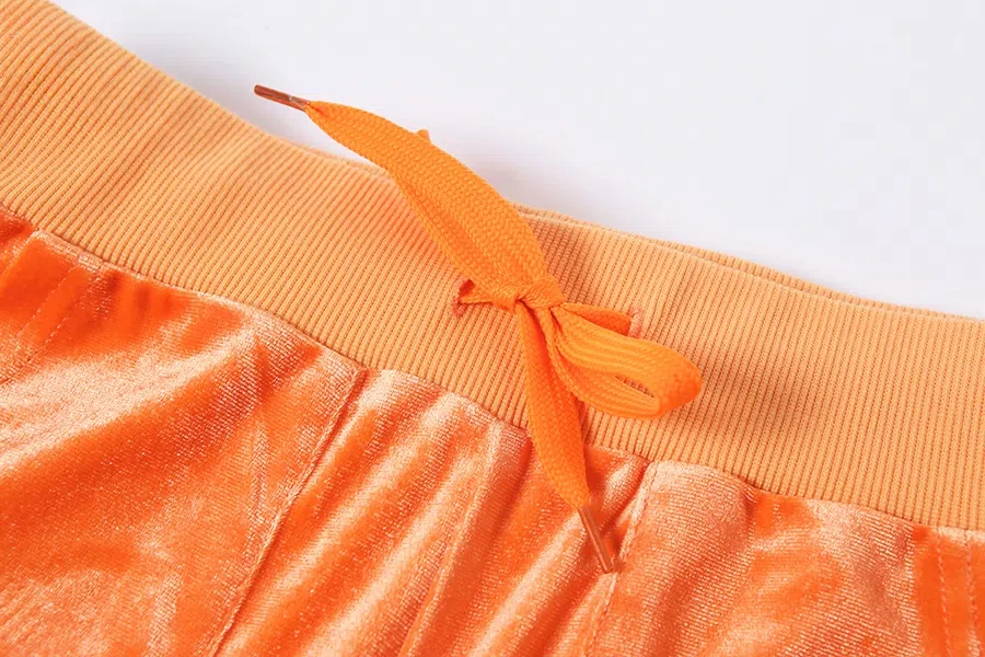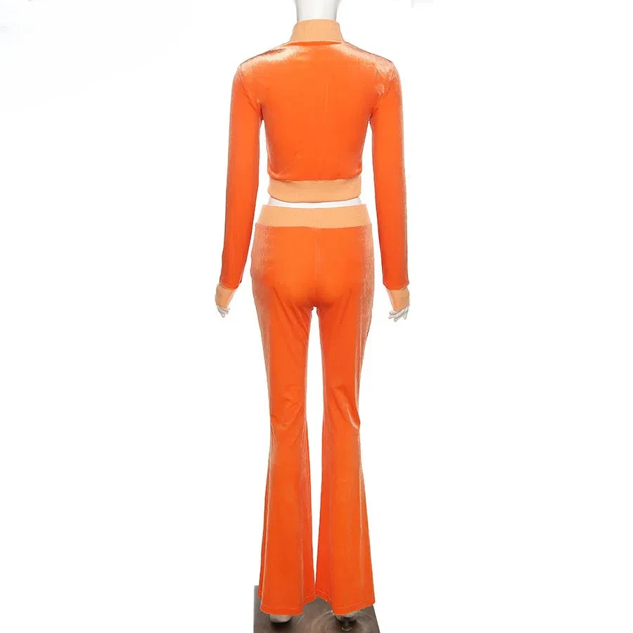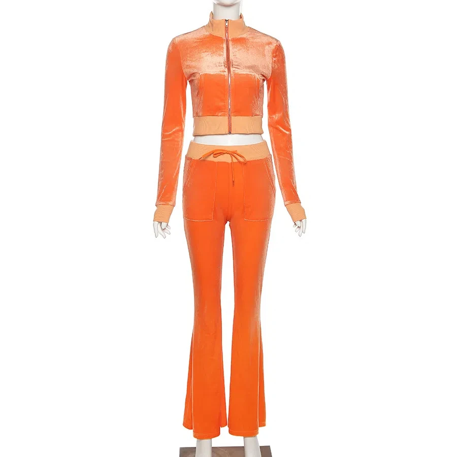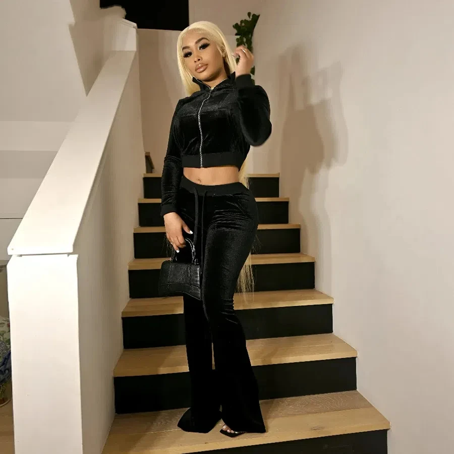 Solid Velour Two Piece Set Women Simple Casual Zipper Long Sleeve Turtleneck Top+Bandage Lace Slim Female Wide Leg Pants