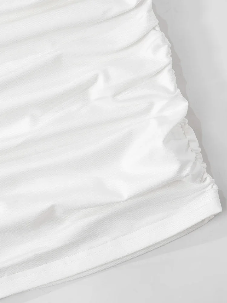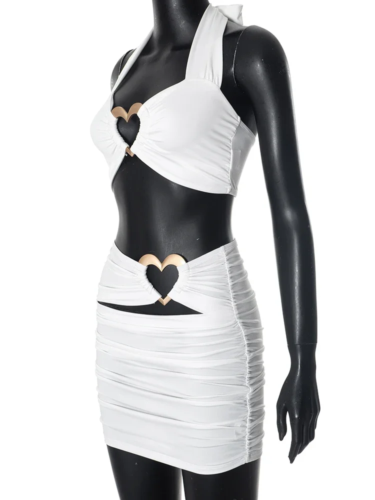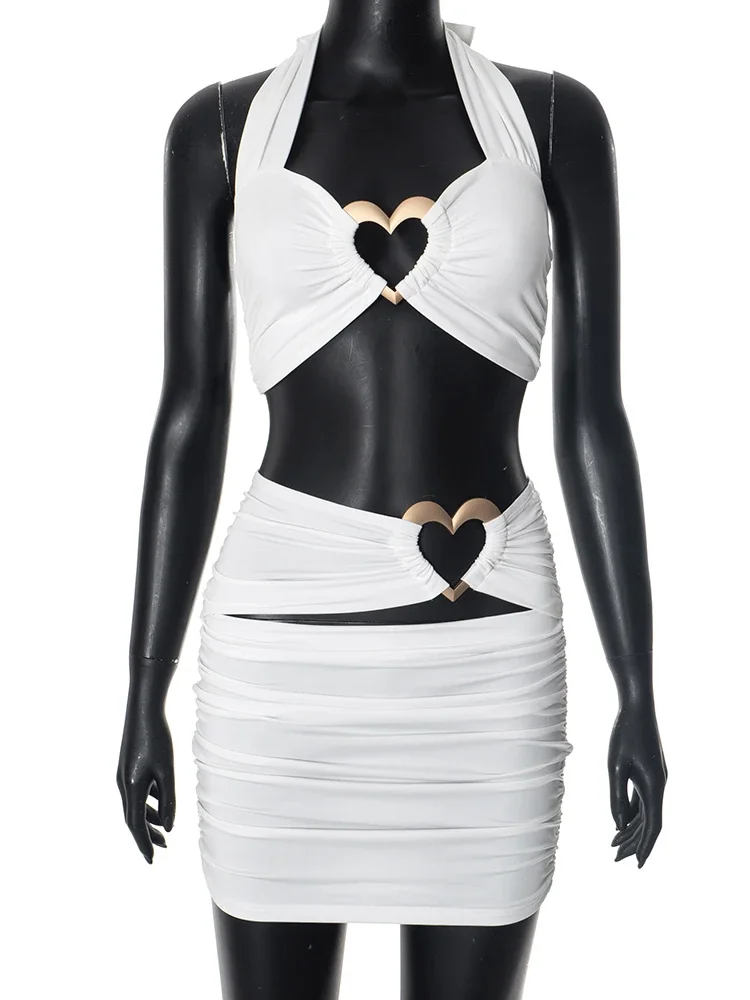 Splice Hollow Women 2 Piece Set Summer Sexy Fashion Solid Halter Cleavage Backless Tops+Pleated Mini Skirts Female Outfits