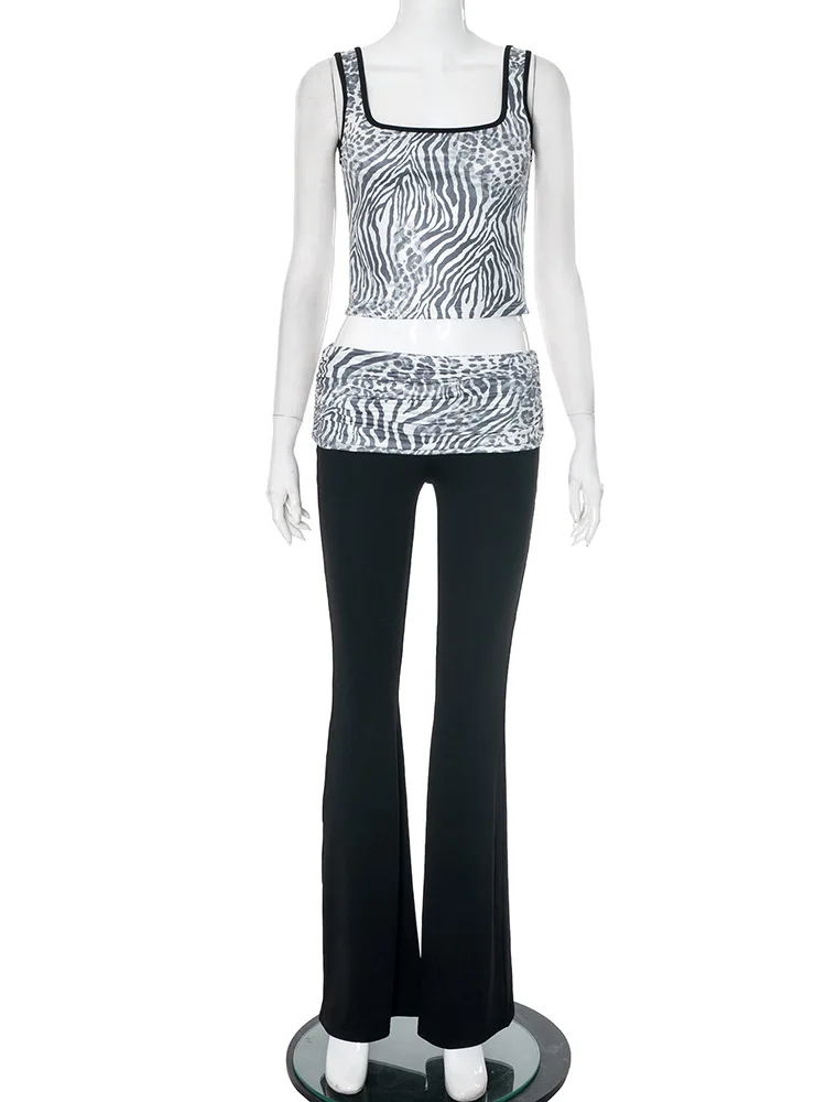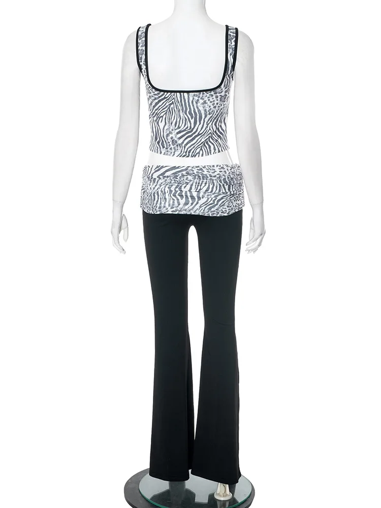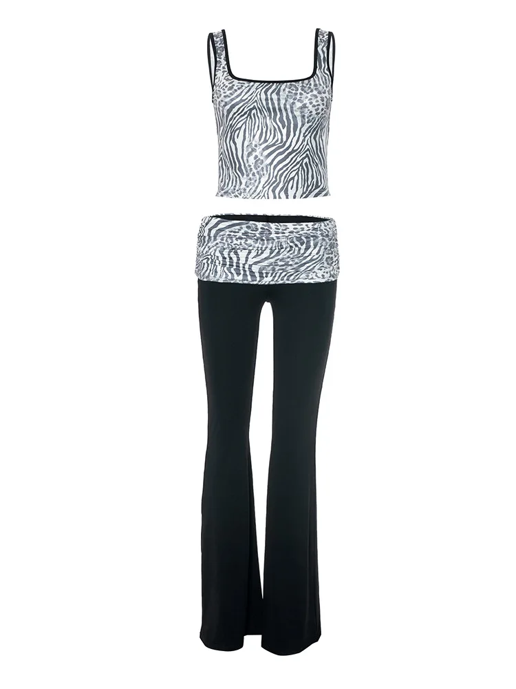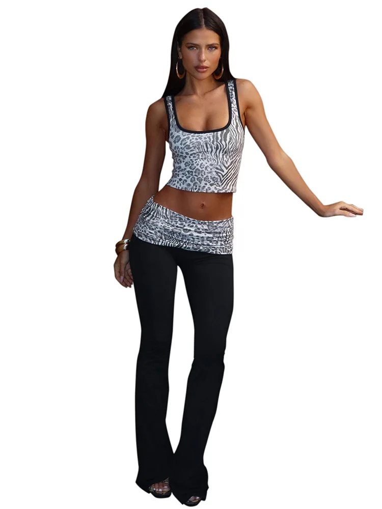 Summer Pants Leopard Outfit Spring Women Sexy Patchwork Square Collar Sleeveless Vest+high Waist Trousers Female Two Piece Set