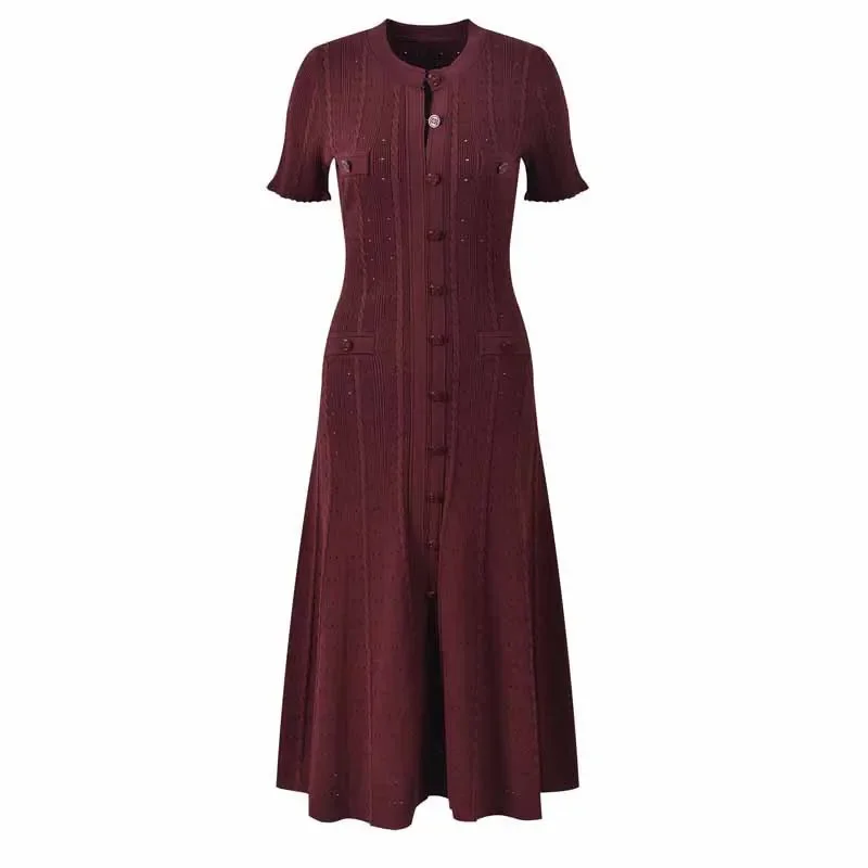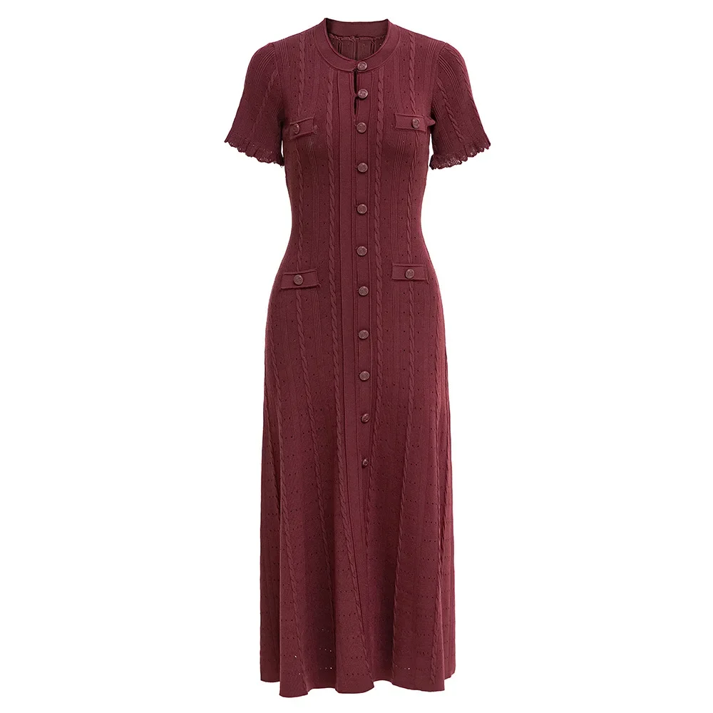 Summer Solid Round Neck Short Sleeved Office Lady Knitted Dress Women Korean Single Breasted Hollow Out Long Dress Fashion Trend