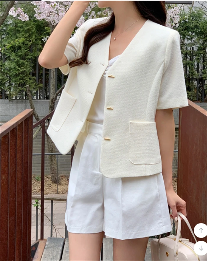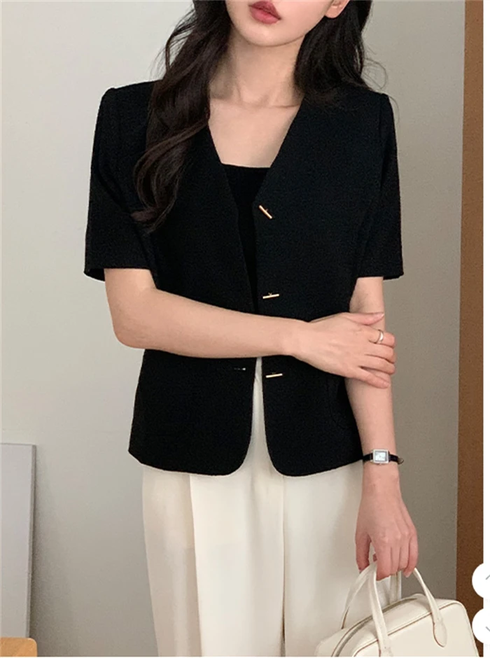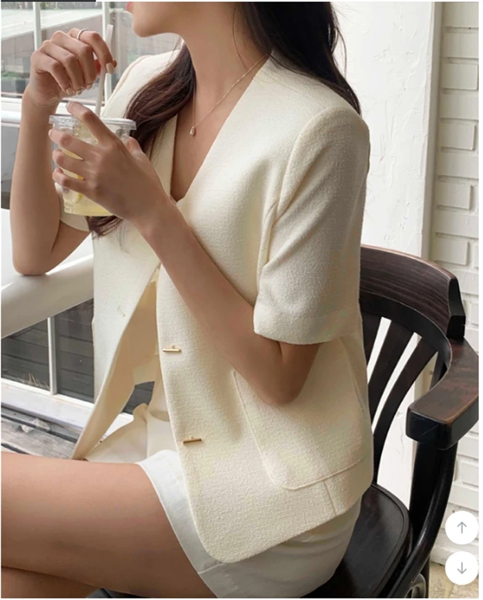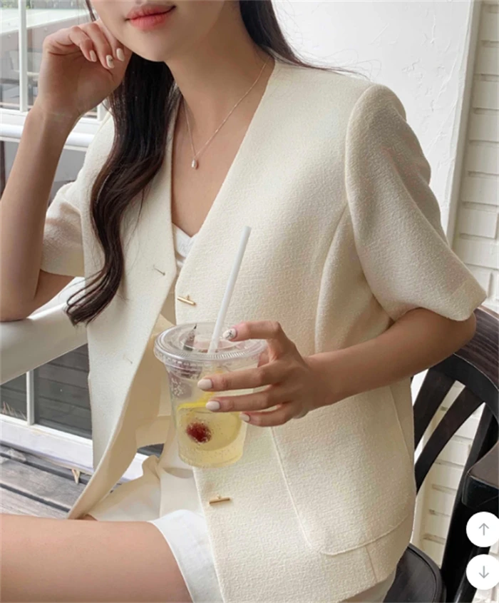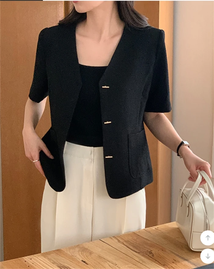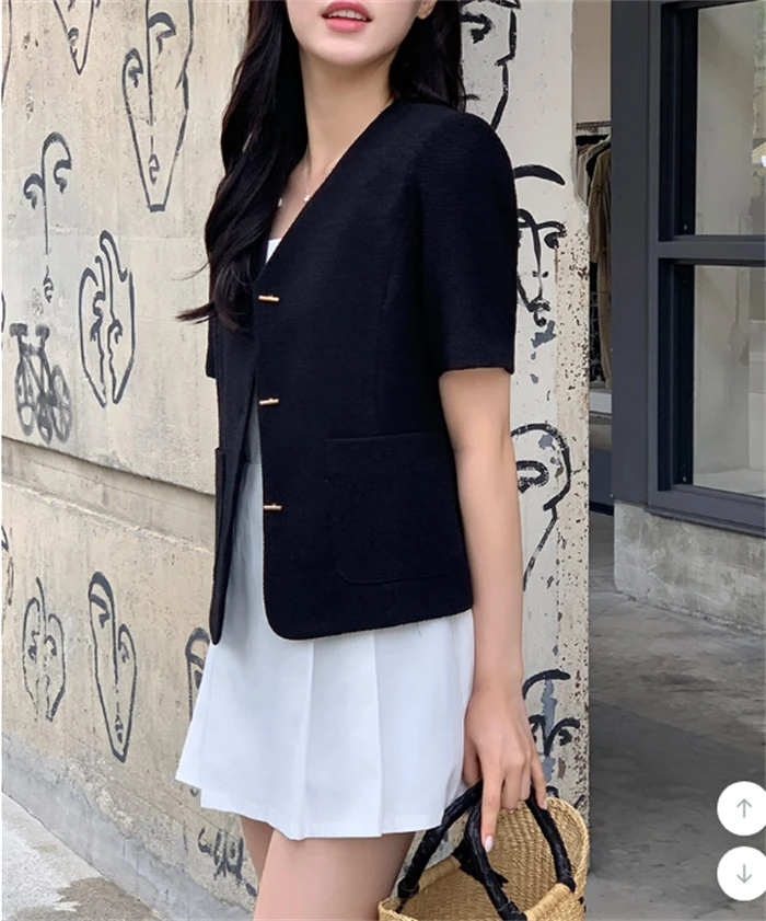 Women Fashion Solid Color V-neck Wool Coat Short Sleeve Jacket Horn Button Outerwear Elegant Office Woolen Winter Overcoat