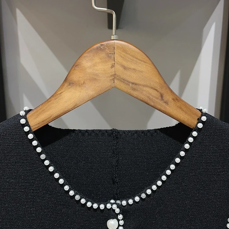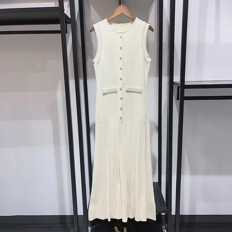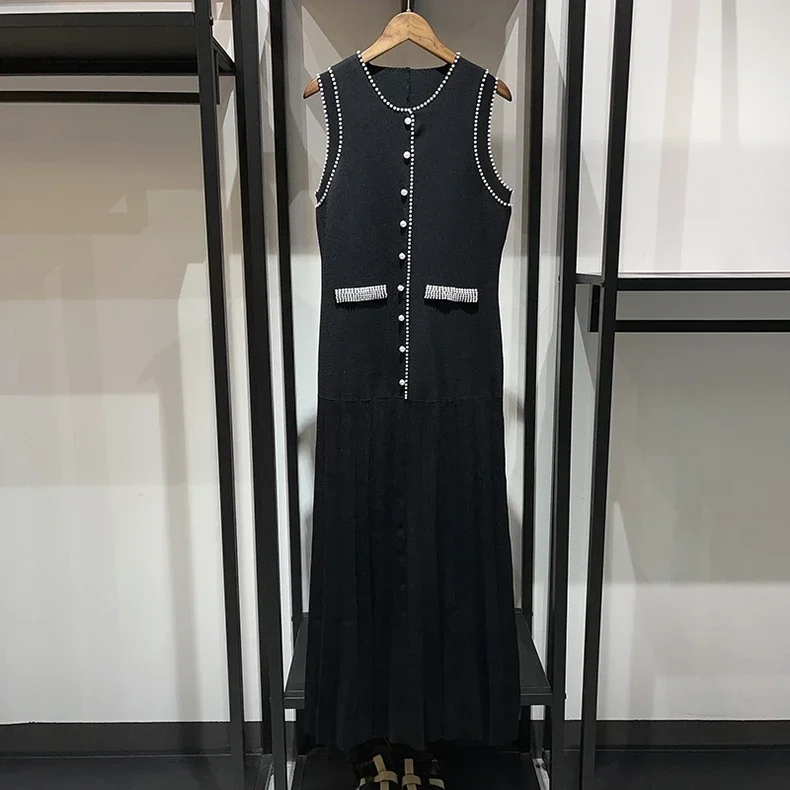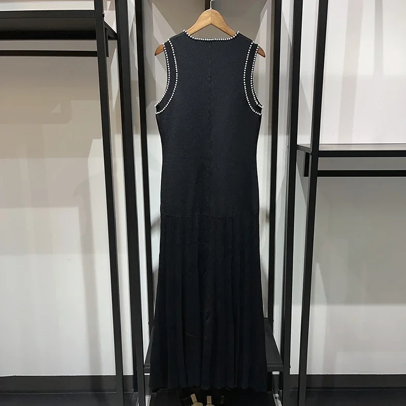 Women Pearl Embellished Knit Dress Round Neck Sleeveless Black Female Knitted Slim Fit Midi Robes 2025 Spring Summer