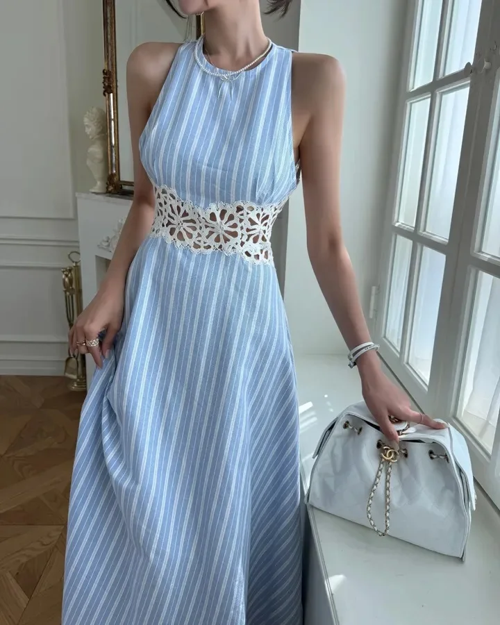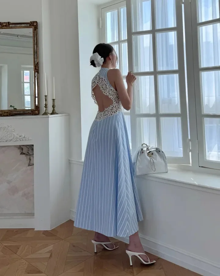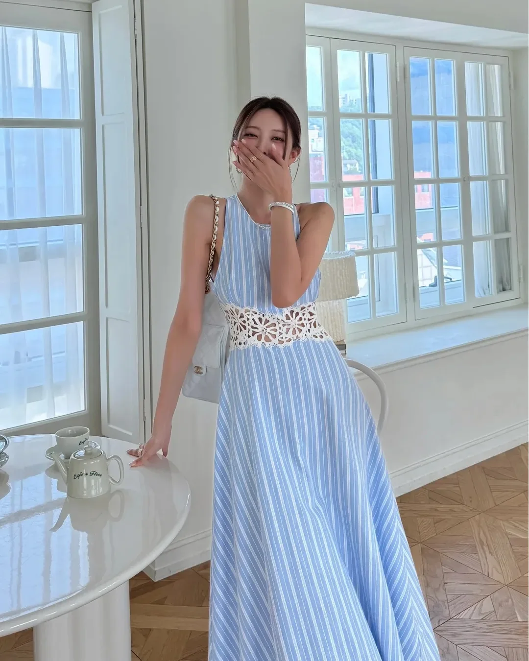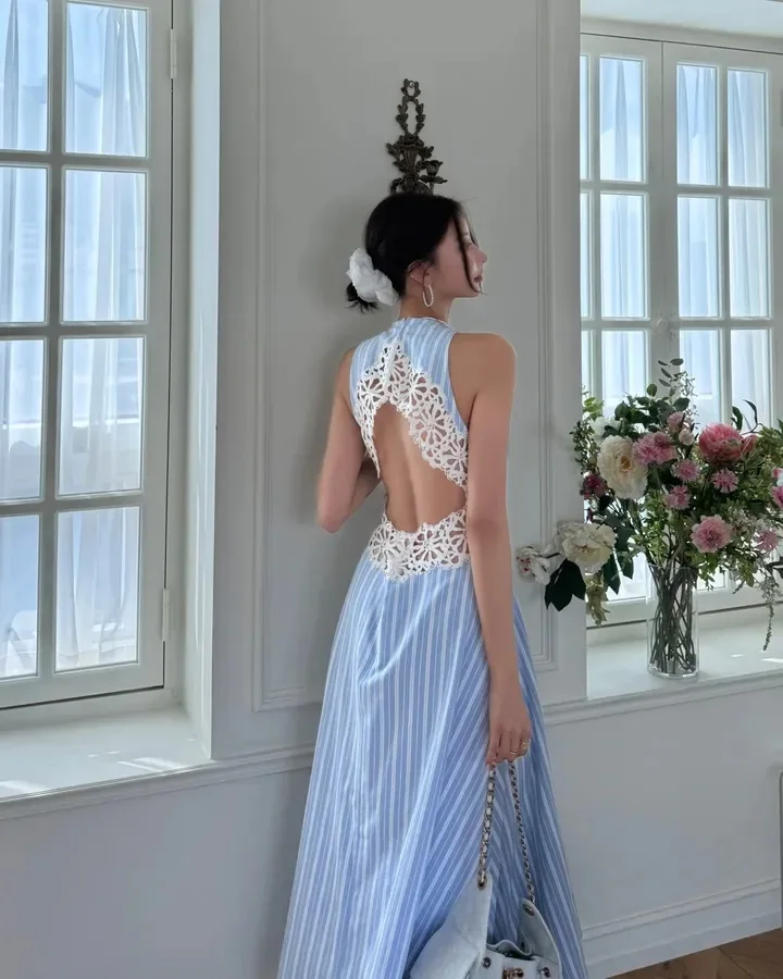Womens Dresses 2025 Summer New Blue Striped Lace Patchwork O-Neck Long Dress Hook Flower Hollowed Out Backless Midi Dresses