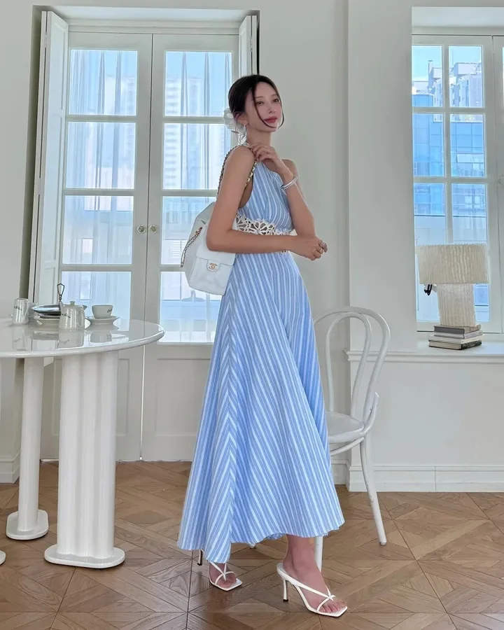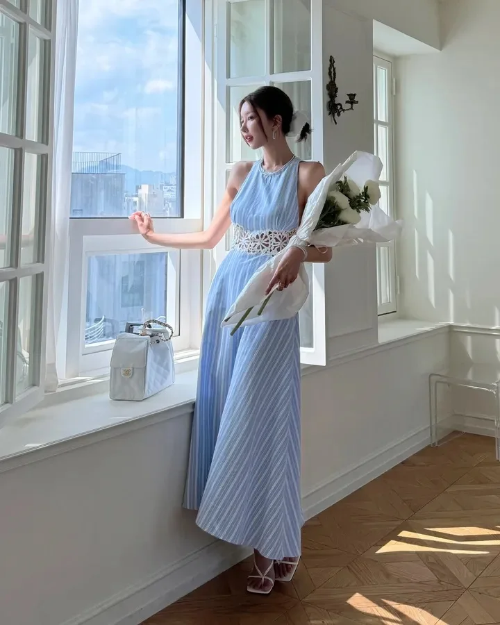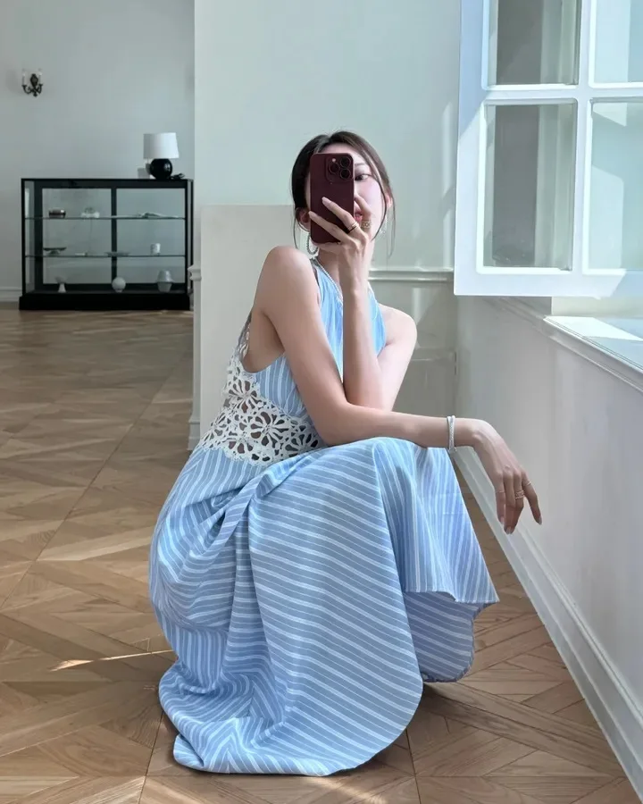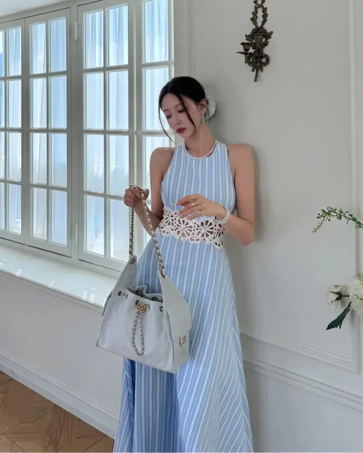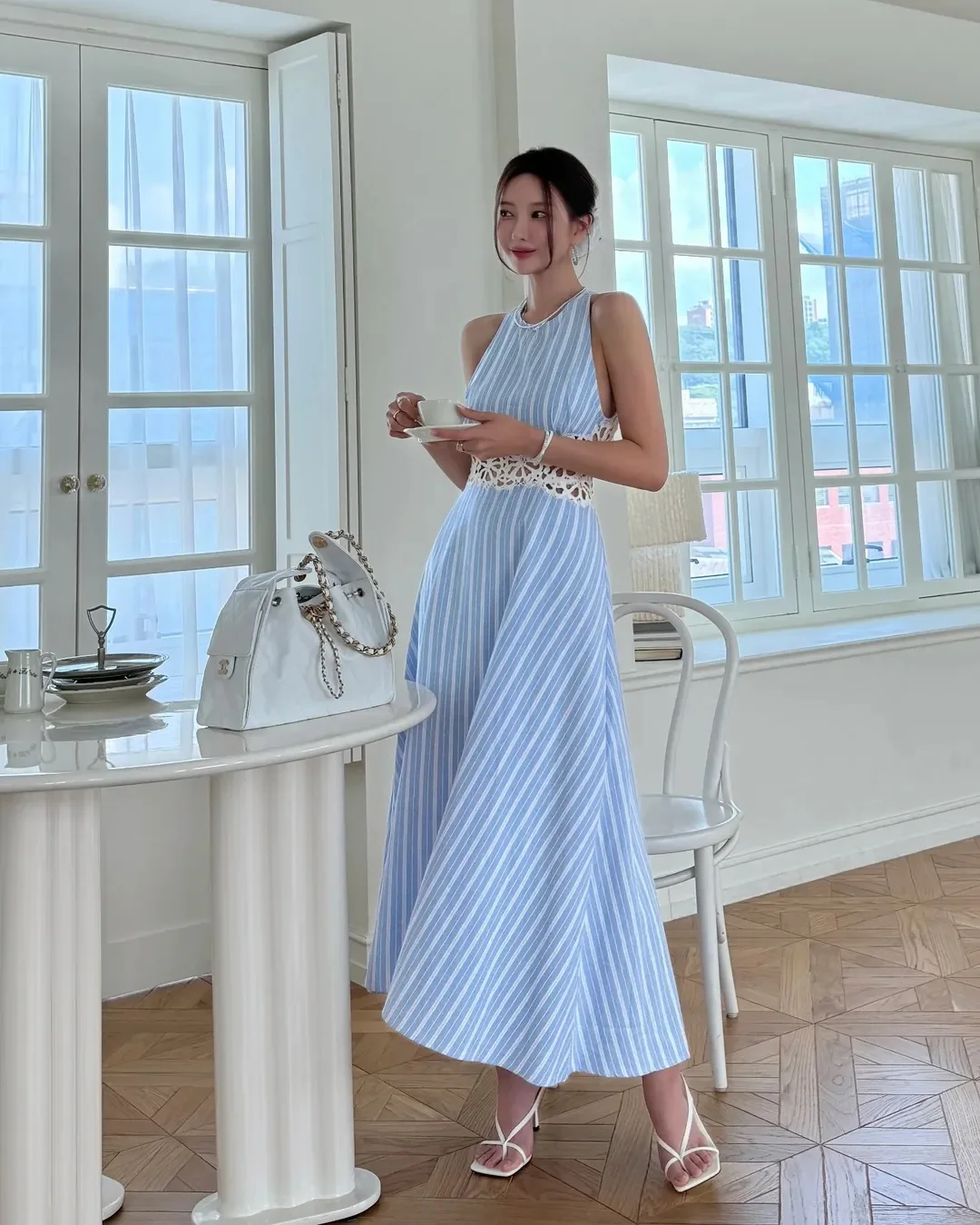 Womens Dresses 2025 Summer New Blue Striped Lace Patchwork O-Neck Long Dress Hook Flower Hollowed Out Backless Midi Dresses