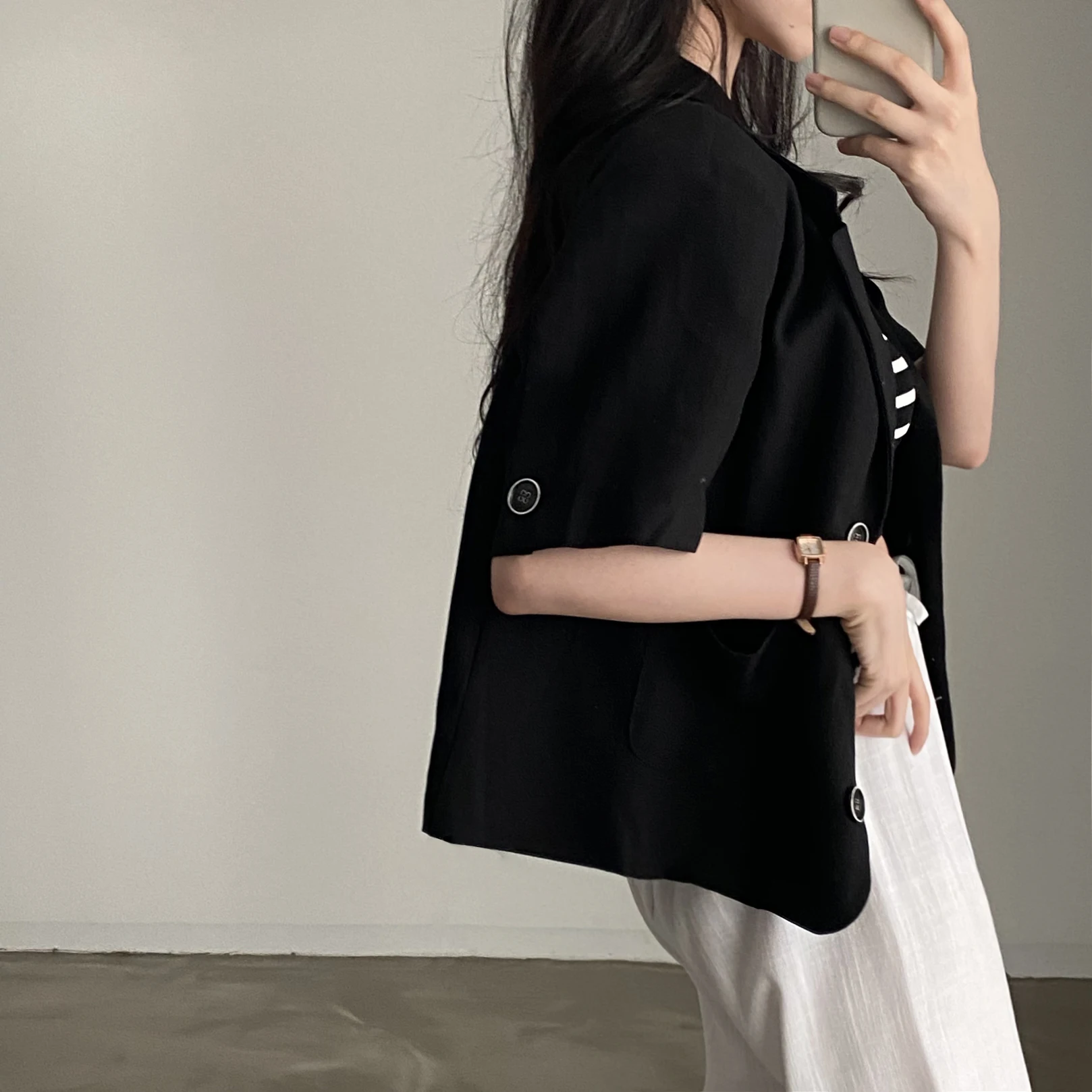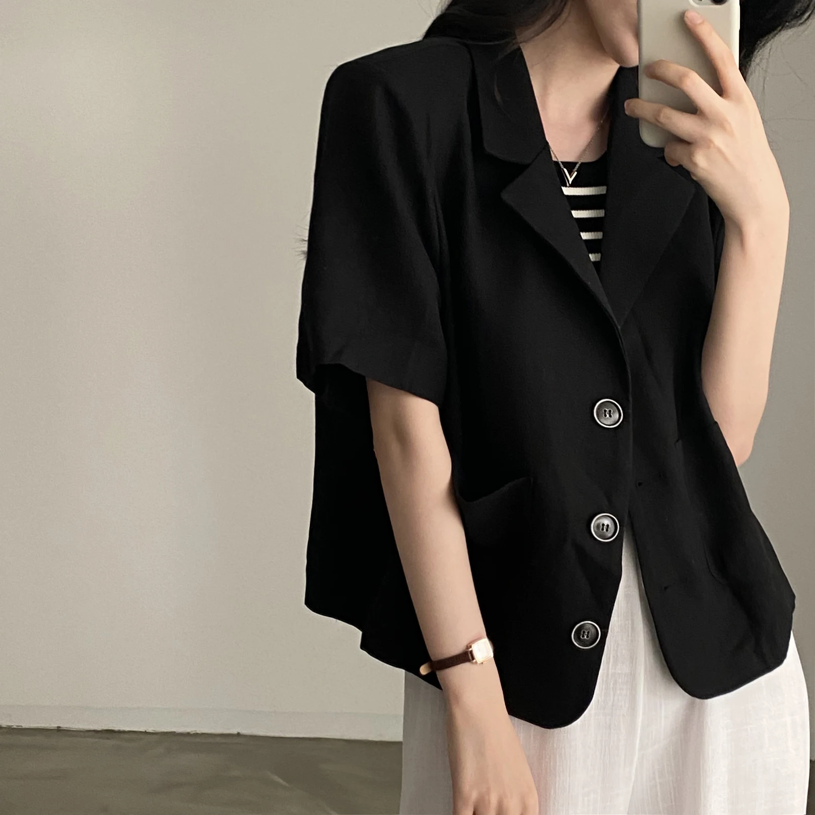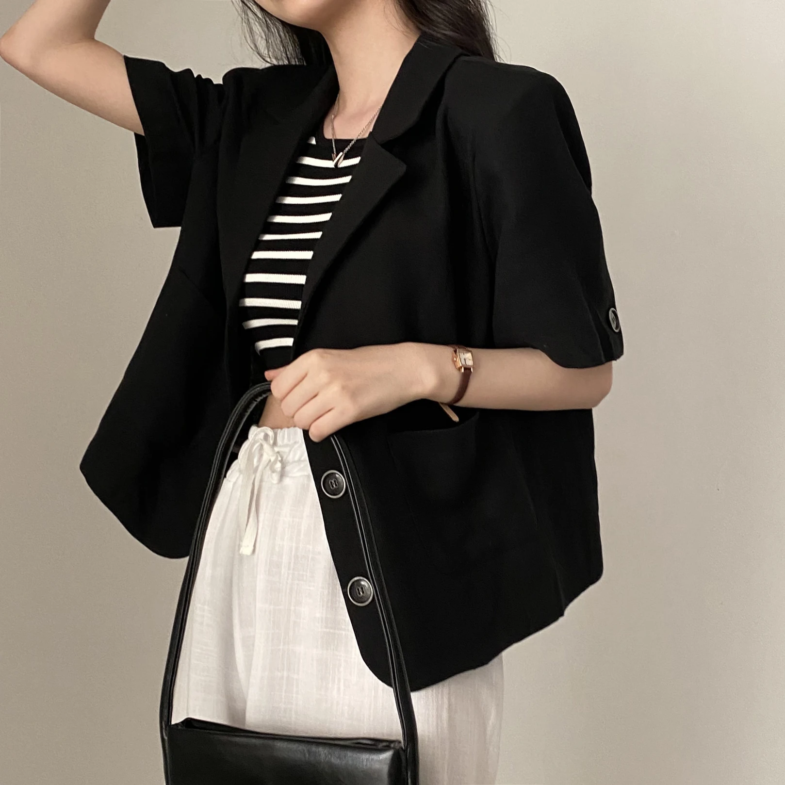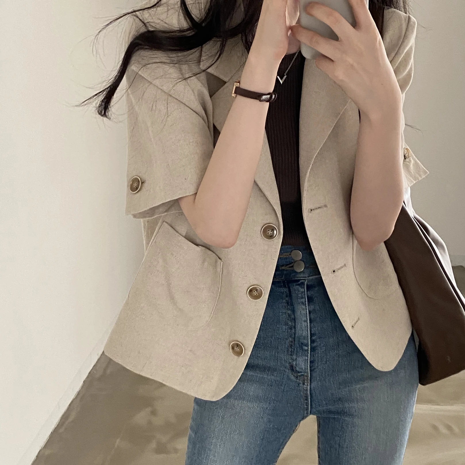 Women's Short Jacket Sweet Elegant Turn-Down Collar Coats Loose Casual Versatile 2025 Spring Summer New Short Sleeve Top